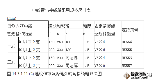 管路在通過建筑物的變形縫時,應加裝管路補償裝置。管路補償裝置是在變形縫的兩側對稱預埋一個接線盒,用一根短管將兩接線盒相鄰面連接起來,短管的一端與一個盒子固定牢固,另一端伸入另一盒內,且此盒上的相應位置的孔要開長孔,長孔的長度不小于管徑的2倍。如果該補償裝置在同一軸線墻體上,則可有拐角箱作為補償裝置,如不在同一軸線上則可用直筒式接線箱進行補償。做法可參照圖14.3.1.11?(1)?(2)。也可采用防水型可撓金屬電線管跨越兩側接線箱盒并留有適當余量。