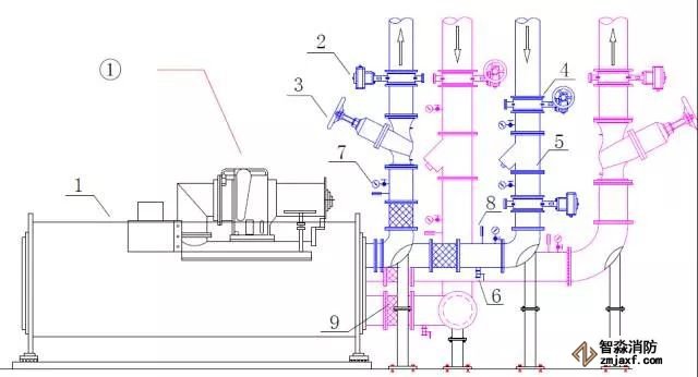 冷水機組常規接管圖:1-冷水機組,2-電動閥,3-平衡閥,4-蝶閥,5-Y 型過濾器,6-泄水閥,7-壓力表,8-溫度計,9-軟接頭。