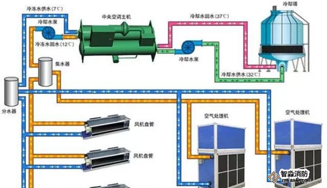 典型中央空調機組主要由冷凍水循環系統、冷卻水循環系統及主機三部分組成: