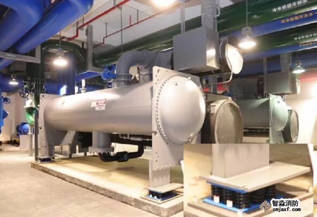 在彈簧減震器下部設置水平度調整鋼板,便于設備一次就位 。機組找平可根據設備的具體外型選定測量基準面,用水平儀測量,擰住地板上的螺栓進行調整,機組縱向、橫向的水平偏差均不大于1/1000。
