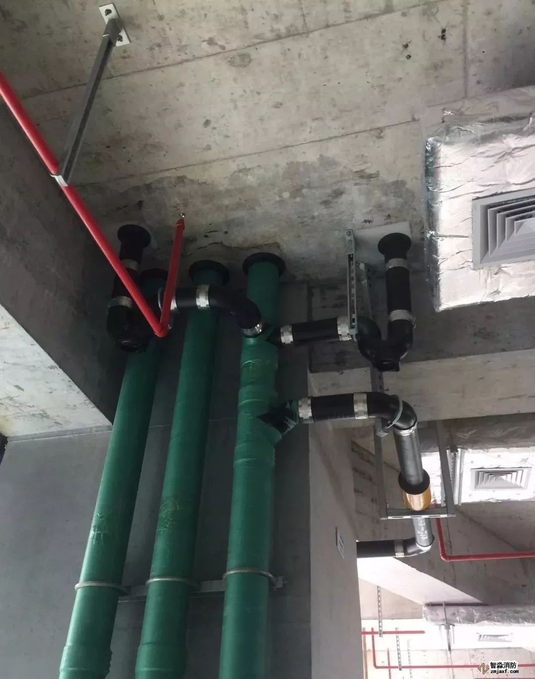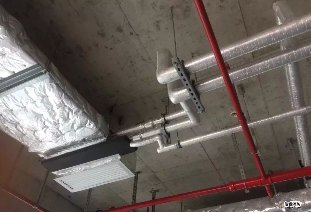 空調(diào)水管道,坡度正確,支架布置合理,保溫整齊美觀。