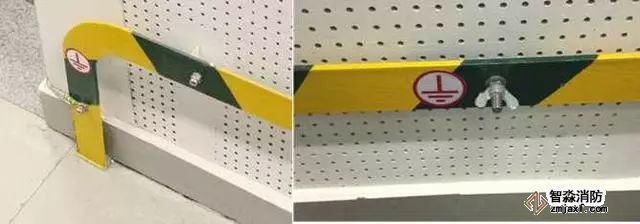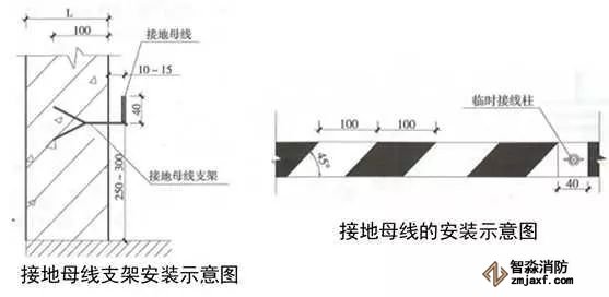 2、配電室接地母線:用扁鋼制作接地母線支架,支架末端加工成燕尾形,埋設深度不小于50mm,出墻平直長度為10~15mm,上彎立面長度為40mm。支架安裝間距為1m,離地面高度為300mm。接地母線應先調直或煨彎后焊接在支架上,接地母線搭接長度大于等于扁鋼寬度的2倍且三面施焊。每房間設不小于2處的蝴蝶螺母作為臨時接線柱,過門處暗敷埋設,轉角用扁鐵煨制圓弧形,煨彎半徑R≥100mm,穿墻板處加設套管保護。接地母線應刷45°斜向黃綠相間標識油漆,條紋間距100mm,臨時接線柱兩側各留20mm寬度不刷漆。