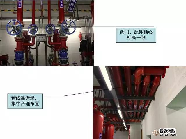 質量控制要點:成排成線,部件標高、朝向一致,維護方便,各專業必須依照綜合管線布置圖施工(距離管線彎頭500mm范圍內應設置支吊架)。