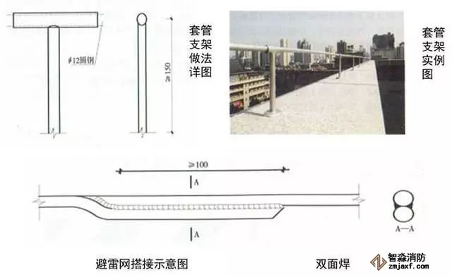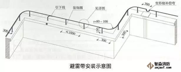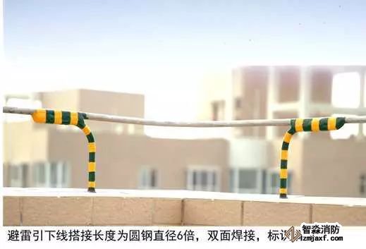 3、圓鋼避雷帶敷設:按設計位置彈線、定位,一般情況下,避雷帶應居女兒墻(屋脊)中心,當女兒墻寬度大于300mm時,支架布設于距外沿150mm處,距變形縫、轉彎300mm處設支架,直線段支架均勻分布,間距不大于1m;支架埋深不小于80mm,出女兒墻頂面不小于150mm,調整、校正支架的垂直度,根部套不銹鋼裝飾圈并用耐候膠密封固定。圓鋼調直后敷設在支架上,轉彎、搭接、變形縫處圓鋼煨彎加工,轉彎處煨彎半徑為80~100mm,搭接處一端鋼筋煨乙字彎,與另一端圓鋼上下搭接,搭接長度為100mm,搭接點宜設在離支架不小于200mm位置處,雙面施焊,焊縫連接飽滿,焊渣清理干凈,焊接點應先刷防銹漆,再刷銀粉漆,防腐處理到位;變形縫處鋼筋煨成向下半圓形。將防雷引下線可靠焊接在避雷帶上。拉通線校正避雷帶的高度、平直度。