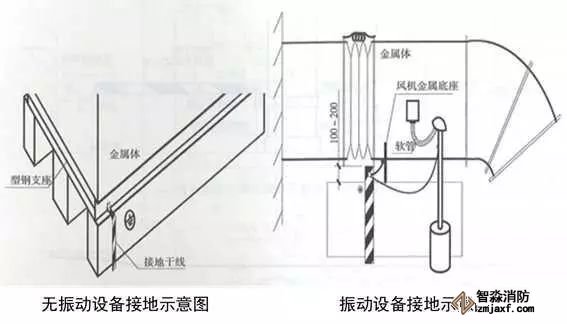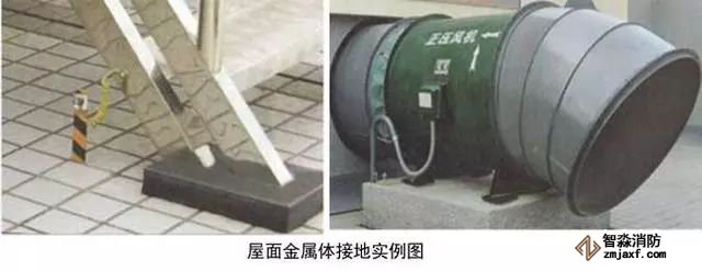 6、屋面金屬體接地:用-25x4的鍍鋅扁鋼從就近的避雷網引接地線,接地扁鋼一端與避雷網連接,另一端在金屬體附近地面引出,應高于設備基礎100~200mm。無振動設備在金屬體上直接焊接,有震動設備和非碳鋼金屬體應用編織軟銅線兩端壓端子跨接,編織軟銅線外套黃綠雙色熱縮套且熱縮。伸出地面的接地母線應刷黃綠相間油漆。體積較大的金屬體應做不小于2處的接地,高度高于避雷網時,應加避雷針保護。接地母線附近應做接地標識。