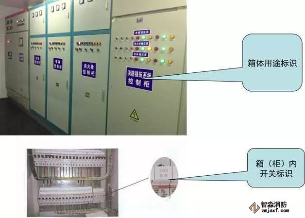 箱(柜)體標識采用自噴漆噴涂或用不干膠紙粘貼方式進行標識,字體寬度為40~45mm左右,內容應反映箱(柜)用途;箱(柜)內開關采用背膠紙打印粘貼在空開上,應反映控制對象的名稱;系統圖采用背膠紙打印,粘貼在箱(柜)門內側合適位置,宜采用A4紙規格尺寸。