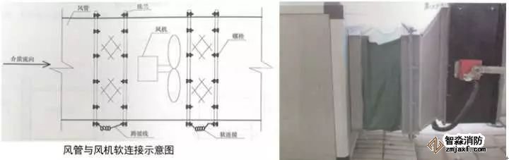 3、風管與風機軟連接:確定風管與風機之間的距離和同心性,距離要求150~200mm,風管、風機同心徑;制作軟接兩端法蘭,中低壓系統法蘭螺栓孔間距120~150mm,高壓及凈化系統距80~100mm,軟接長度為法蘭間距加20~30mm伸縮量,用鉚釘將軟接均勻平整的固定在法蘭上,鉚釘位置和法蘭螺栓位置對應,風機法蘭與風管法蘭螺栓孔對應,螺栓朝向與介質流向一致,螺栓外露長度為2~3扣絲。屋面與防暴場所采用不小于4mm²的黃綠雙色銅芯軟線壓接銅鼻子接地跨接。成排風機中心線應在一條線上。