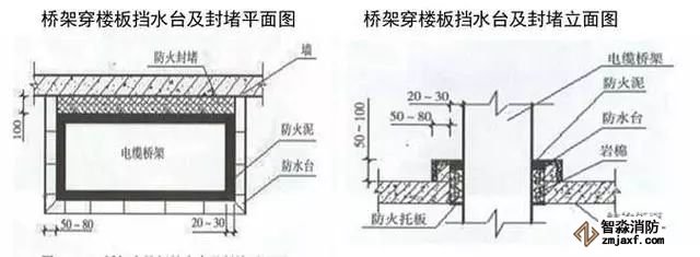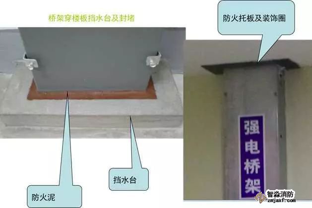 5)電井應設門檻,橋架、插接母線在地面或穿樓板處有不低于50mm的擋水臺,橋架、插接母線穿樓板處應做20~30mm防火封堵,頂部設置防火托板,加裝飾圈。