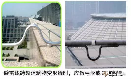 屋頂設置避雷針或避雷線,主要作用是對建筑物和屋面設備起到保護作用。其質量控制主要為:屋面的設備、金屬構件、金屬管道、金屬支架、電氣設備金屬外殼都必須和接地干線可靠連接。避雷線安裝應平直,鍍鋅層完好,接頭應采用雙面焊接,圓鋼搭接長度6倍直徑,焊接焊口須防腐處理。引下線宜采用圓鋼或扁鋼。當采用圓鋼時,直徑不應小于8mm。當采用扁鋼時,截面不應小于48mm2,厚度不應小于4mm。對于裝設在煙囪上的引下線,圓鋼直徑不應小于12mm。扁鋼截面不應小于100mm2且厚度不應小于4mm。避雷帶跨越建筑物變形縫時,應設補償裝置。接閃器應熱鍍鋅,焊接處應涂防腐漆。在腐蝕性較強的場所,還應加大其截面或采取其他防腐措施。