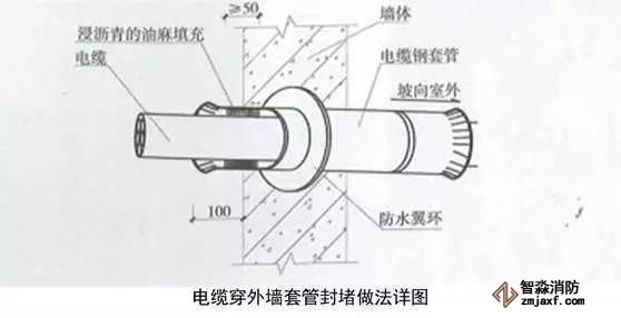 2、電源管穿外墻做法:在穿外墻位置敷設套管,宜內高外低并設止水翼環,管徑為電纜外徑的2倍,長度為每邊出墻面100mm。有散水時應伸出散水外邊沿100mm,套管兩端制作喇叭口,內壁刷防銹漆,外壁出墻刷瀝青漆。電纜穿入套管后,兩端嵌入瀝青麻絲,瀝青麻絲在套管內填充密實,距管口深度大于50mm,并應使電纜在套管內居中。