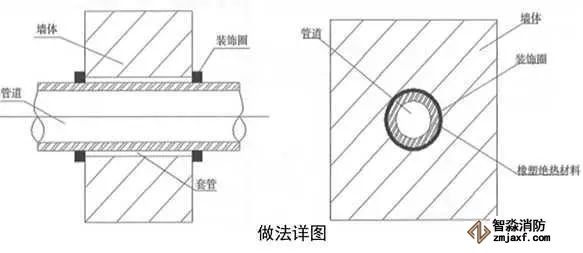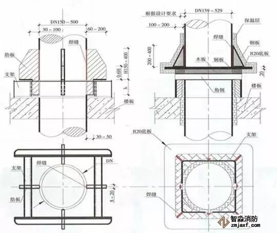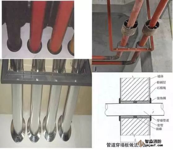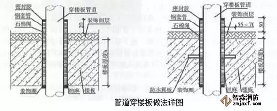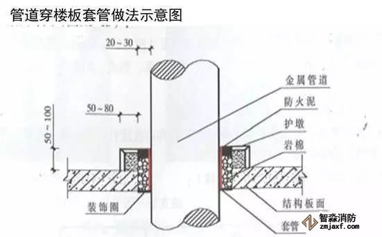 當管道穿過防火堤、防火墻、樓板時,應安裝套管。穿防火堤和防火墻的套管長度不應小于防火堤和防火墻的厚度,穿樓板套管長度應高出樓板50mm,底部與樓板底面相平;管道與套管間的空隙應采用防火材料封堵。