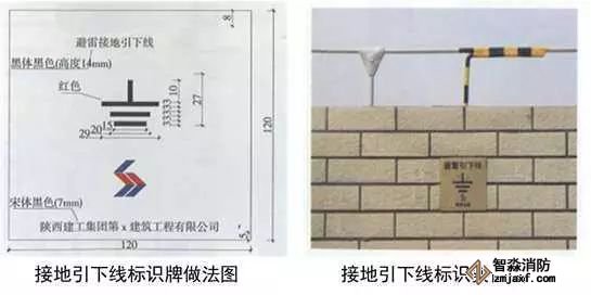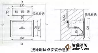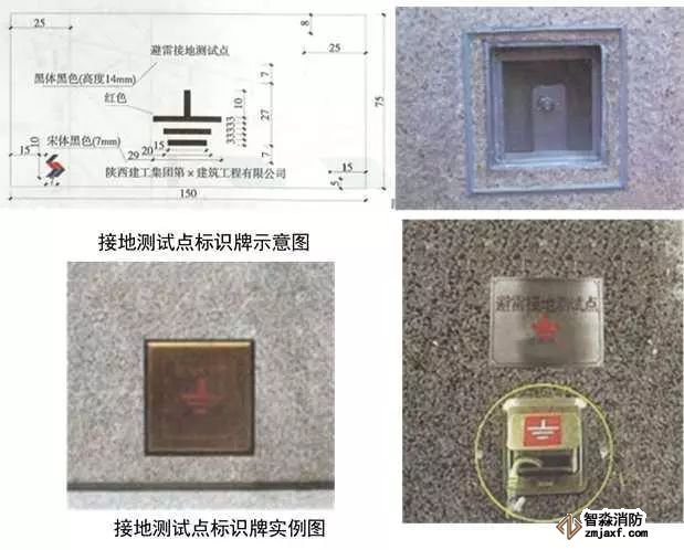 1、避雷接地測試點:預埋扁鐵鋼及100x100x50線盒,線盒與墻面平齊,鍍鋅扁鋼鉆φ12孔,安裝防松墊片及蝴蝶螺母,螺母居預埋盒中心。編織軟銅線一端連接在蝴蝶螺母上,另一端壓接銅鼻子用于接地測試。銅質面板用螺絲固定在預埋盒上,在測試點正上方50mm處粘貼銅質或不銹鋼標識牌,標識牌應標明接地測試地點、接地符號、施工單位、編號,標高尺寸及位置與相鄰沉降觀測點及標識牌一致。