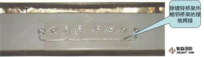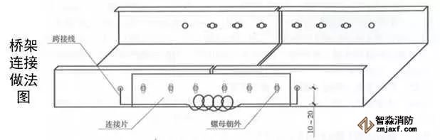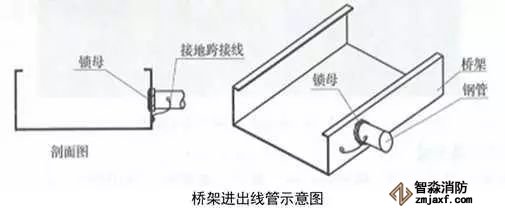 3、橋架進出線管:根據出線口位置,在橋架側面開孔,一管一孔。管端套5~6扣絲,與橋架連接內外側采用鎖母固定,管口伸入橋架內不大于5mm,導管與橋架采用不小于4mm²的軟銅線接地跨接。