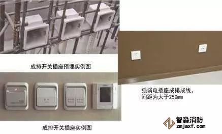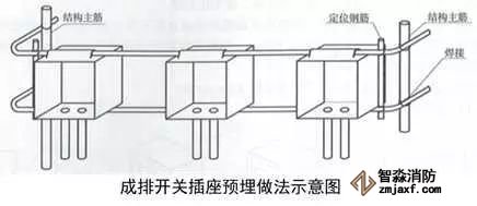2、成排開關插座盒安裝:根據結構500mm線和結構墻面線,確定成排線盒的高度及位置,墻內主筋上做標記,上下用兩根鋼筋穿接線盒,兩側加短鋼筋與結構立筋焊接定位,盒口與模板面平齊,固定端正牢靠,間距均勻。