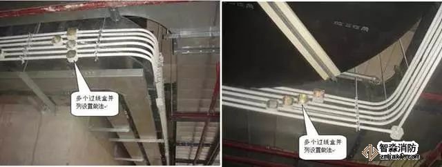 1、過路接線盒:在導管敷設時,按照規范要求在適當位置設置過路接線盒。過路盒安裝時距地高度宜為300mm;在結構板內安裝過路盒時,應用扎絲綁緊,盒內填充密實,表面用膠帶密封;導管應垂直進入線盒,焊接管絲頭伸入線盒內長度不大于5mm,盒子內外鋼管鎖母上緊,(或KBG、JDG管可用盒接頭與過路接線盒連接)接地,用φ6圓鋼在焊管間、焊管與過路盒間進行接地跨接;盒內穿線應留有適當余量;管口加護口;安裝過路盒面板,面板緊貼墻面或頂面。