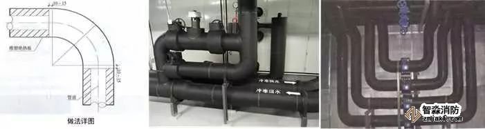 2、保溫管道穿墻處理:保溫管道穿墻、板時,保溫層應連續。應采用橡塑保溫管(板)進行穿墻、穿樓板保溫,用橡塑專用膠粘接牢固,接縫嚴密,兩端與墻面平齊,對接嚴密平整,兩側加牢固規整裝飾圈保護。保溫管(板)與墻、板面根部應粘貼裝飾圈,接縫應放在頂部或正視不明顯處,裝飾圈寬度20~50mm。