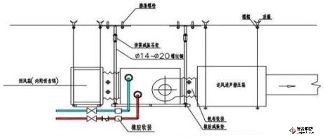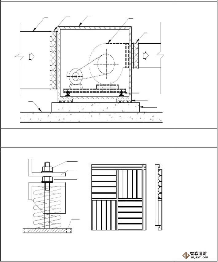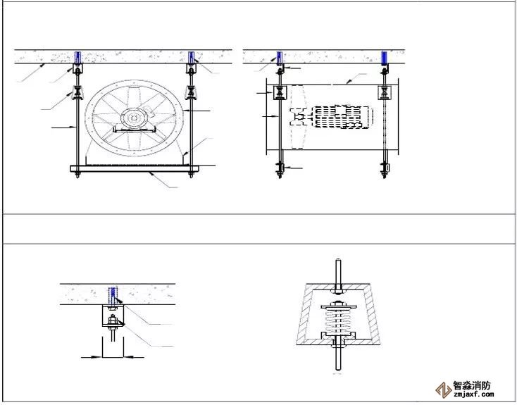 為防止軸流風機工作時擺動,用槽鋼做成框架固定在樓板上,圖為排風兼排煙風機下部設置阻尼彈簧減震器