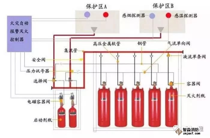5)氣體滅火防護區出口外上方應設置表示氣體噴灑的火災聲光警報器,指示氣體釋放的聲信號應與該保護對象中設置的火災聲警報器的聲信號有明顯區別。啟動氣體滅火裝置、泡沫滅火裝置的同時,應啟動設置在防護區入口處表示氣體噴灑的火災聲光警報器;組合分配系統應首先開啟相應防護區域的選擇閥,然后啟動氣體滅火裝置、泡沫滅火裝置。