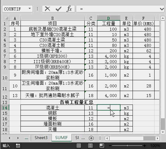 大家在統計工程量的各項技術指標時,往往先需要匯總各項工程量(如混凝土的總和),該項工作特別麻煩,還容易出錯,有什么方法可以一步到位呢?常用函數Sumif可以幫大家解決這個問題。案例如下: