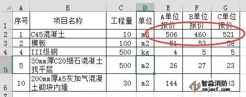 對于業主或造價咨詢人員在對投標文件進行回標分析的時候一定是時間緊、任務重,如何才能快速地將各家單位投標單價中的最高價和最低價以不同顏色突出顯示,以方便下一步去判斷各投標單位的投標報價高低。條件格式就可以幫我們這個忙。下面請看案例: