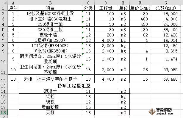 請注意,需要將各項工程量進行分類(如11、12……)。筆者再解釋下單元格D14的公式“=SUMIF($C$2:$C$12,C14,$D$2:$D$12)”:第一個參數“$C$2:$C$12”和第三個參數”$D$2:$D$12“必須保持單元格行數對應。比如本案例中"分類"列的起始行數為2,"工程量"列的起始行數也必須為2。同樣,"分類"列的結束行數為12,"工程量"列的結束行數也必須為12。另外,這兩個參數必須用”$”鎖定單元格,這么做是為了方便后期批量復制單元格的時候分類匯總數據不會隨粘貼單元格位置的不同而變化。
