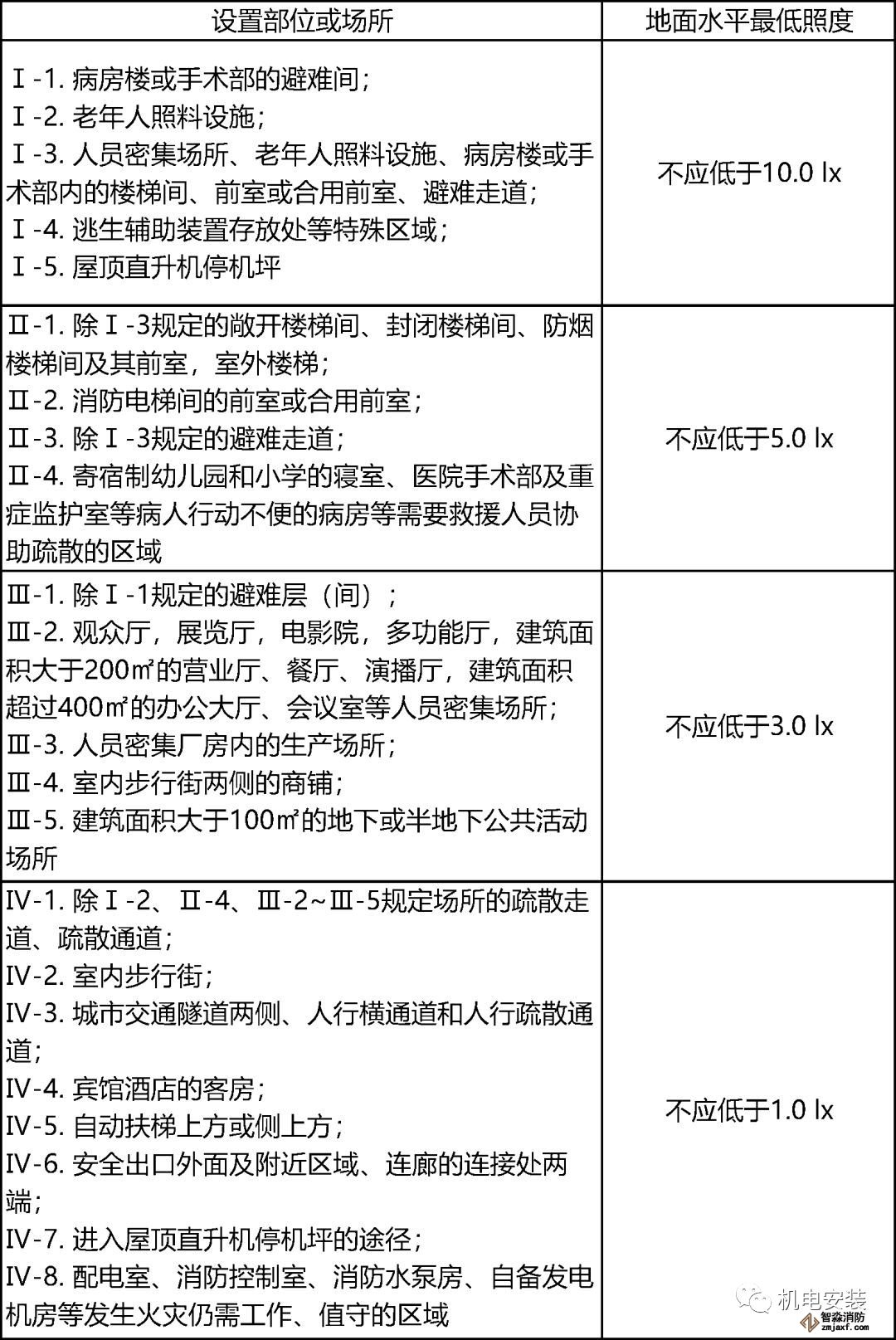 2)對于人員密集場所、避難層(間),不應低于3.0lx;對于老年人照料設施、病房樓或手術部的避難間,不應低于10.0lx。