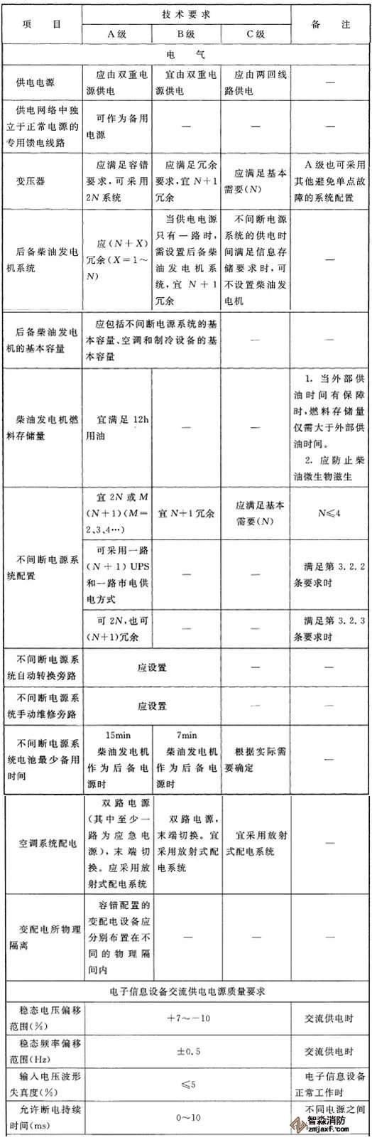 1、數(shù)據(jù)中心用電負荷等級及供電要求應根據(jù)數(shù)據(jù)中心的等級,按下表技術要求執(zhí)行,并應符合現(xiàn)行國家標準《供配電系統(tǒng)設計規(guī)范》GB 50052的有關規(guī)定。