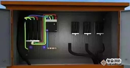2、線路的黃、綠、紅三相線接入到二級分配電箱的總隔離開關上,淡藍色的N線接入到漏電保護器的N端上,通過漏保后接到工作零線端子板。