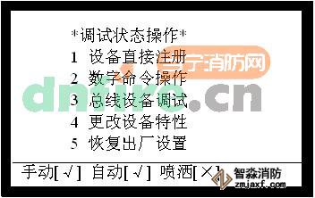 按下“系統(tǒng)設(shè)置”按鍵,在系統(tǒng)設(shè)置操作狀態(tài)下,鍵入“6”,便進(jìn)入調(diào)試操作狀態(tài),如圖2所示。調(diào)試狀態(tài)提供了設(shè)備直接注冊(cè)、數(shù)字命令操作、總線設(shè)備調(diào)試、更改設(shè)備特性、恢復(fù)出廠設(shè)置五種操作。