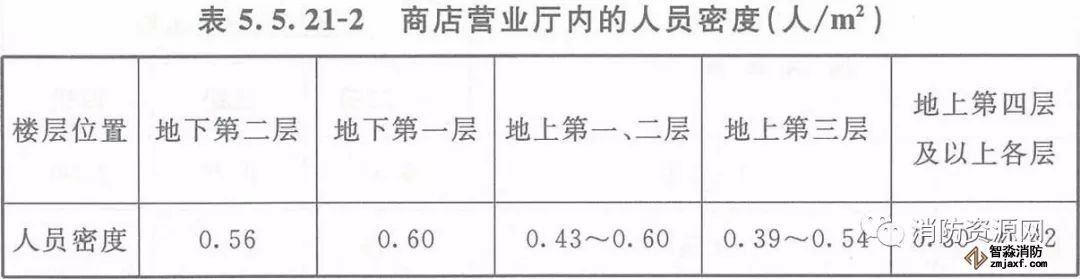 注2:根據(jù)表5.5.21-2確定人員密度值時,應(yīng)考慮商店的建筑規(guī)模,當建筑規(guī)模較小(比如營業(yè)廳的建筑面積小于3000m²)時宜取上限值,當建筑規(guī)模較大時,可取下限值。當一座商店建筑內(nèi)設(shè)置有多種商業(yè)用途時,考慮到不同用途區(qū)域可能會隨經(jīng)營狀況或經(jīng)營者的變化而變化,盡管部分區(qū)域可能用于家具、建材經(jīng)銷等類似用途,但人員密度仍需要按照該建筑的主要商業(yè)用途來確定,不能再按照上述方法折減。