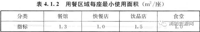 1、飲食或餐飲建筑可根據用餐區域的每座最小面積計算安全疏散人數,用餐區域每座最小使用面積宜符合表4.1.2的規定。(4.1.2)