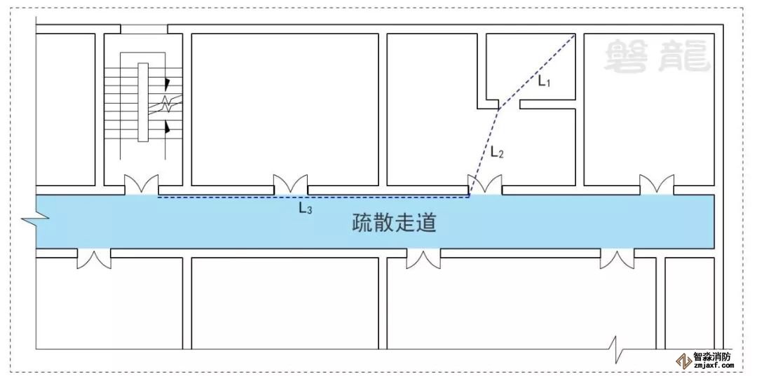 3、確因功能需要,嵌套(穿套)設置的房間不應超過一級,疏散距離應按人員行走的直線距離計算,在圖示4的公共建筑中,示例房間內(nèi)任一點至房間直通疏散走道的疏散門的直線距離,應為L1+L2。