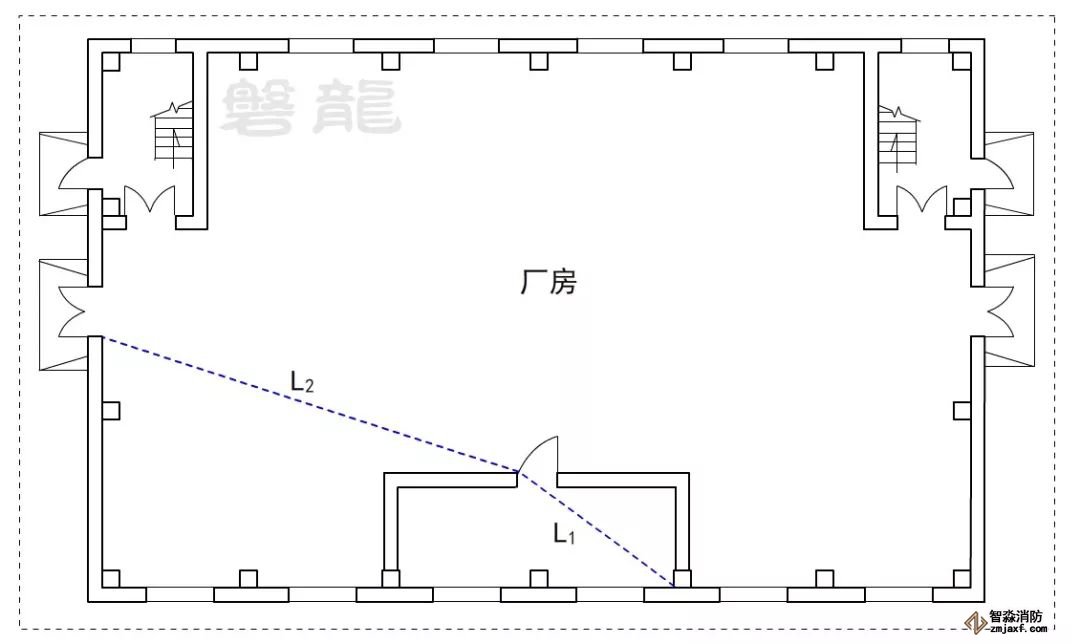 2、廠房倉庫同樣不應采用嵌套(穿套)設置的方式,確因功能需要,嵌套(穿套)設置的房間不應超過一級,疏散距離應按人員行走的直線距離計算,在圖示6的廠房中,示例房間內(nèi)任一點至安全出口的直線距離,應為L1+L2。