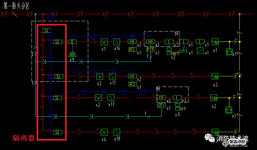 值得注意的是,許多設計人員都有一個疑問,電源總線需要接隔離器嗎?因國標圖集(上圖)的畫法電源總線也接入了隔離器,因此在設計時多數都按圖集畫法設計,有些設備廠家為了迎合圖集的做法也生產有24v電源的隔離器,但實際應用中使用效果并不佳,容易誤動作。