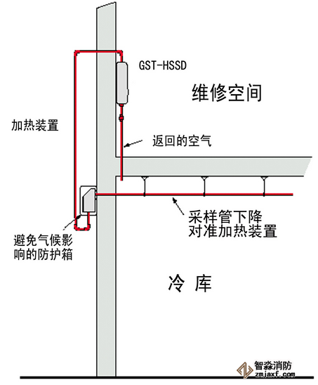 冷庫中采樣管,加熱箱和吸氣式感煙火災探測器的相對位置