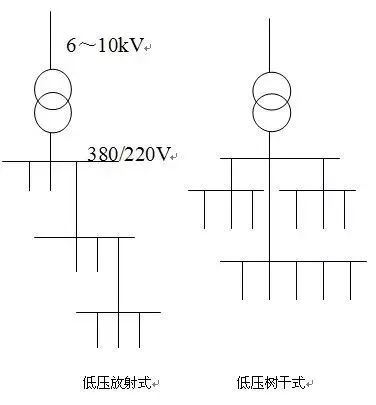 低壓配電系統的接線方式有三種,分別是放射式、樹干式和混合式。