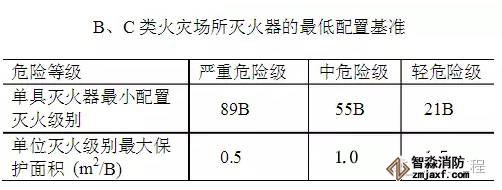 新規范規定:B、C類火災配置場所的最低配置基準是單具滅火器最小配置滅火級別為: 嚴重危險級為89B, 中危險級為55B, 輕危險級為21B,;