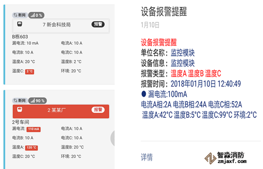 現場配電柜(箱)監測值一旦發生安全異常,觸發本地報警器發出聲、光報警,通過云平臺監管系統手機APP、Web客戶端同步發出報警提示,多種方式提醒值班人員檢修。