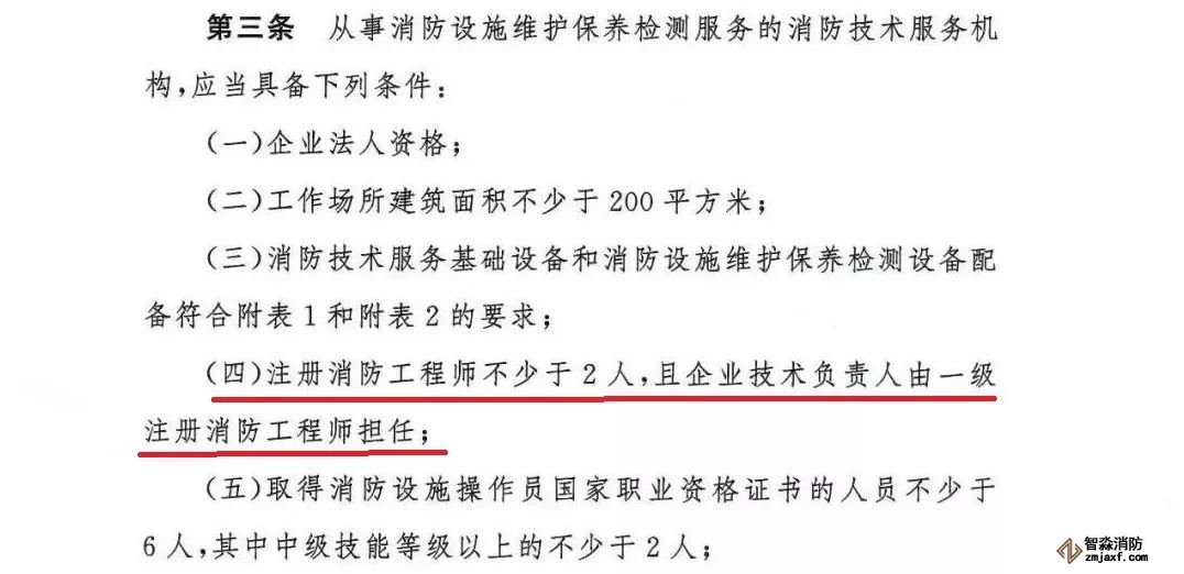 8月29日,應(yīng)急管理部發(fā)布《消防技術(shù)服務(wù)機構(gòu)從業(yè)條件》的通知,明確要求:從事消防設(shè)施維護保養(yǎng)檢測服務(wù)的消防技術(shù)服務(wù)機構(gòu),注冊消防工程師數(shù)量不少于2人,且企業(yè)技術(shù)負責(zé)人由一級消防工程師擔任。