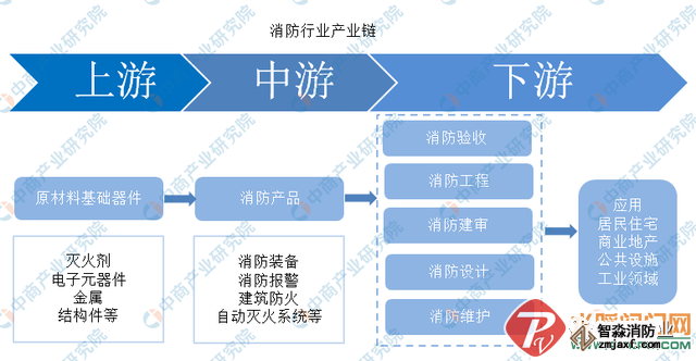 消防既包括“消”,又包括“防”。消防產業鏈條長,主要分為消防設計、消防建審、消防產品、消防工程、消防驗收、消防維保等環節。消防產品是整個產業的核心環節。消防產品主要包括:消防裝備、消防報警、建筑防火、自動滅火系統等。