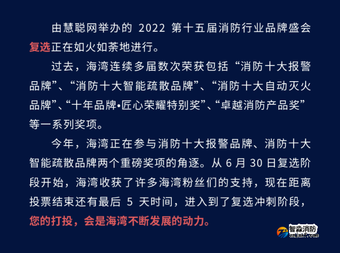 今年,海灣正在參與消防十大報警品牌、消防十大智能疏散品牌兩個重磅獎項的角逐。從 6月 30 日復選階段開始,海灣收獲了許多海灣粉絲們的支持,現在距離投票結束還有最后 5 天時間,進入到了復選沖刺階段,您的打投,會是海灣不斷發展的動力。