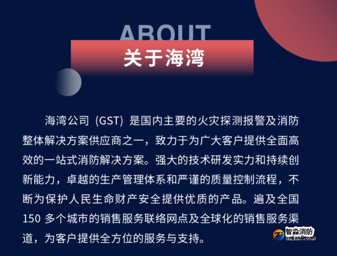 海灣公司(GST)是國內主要的火災探測報警及消防整體解決方案供應商之一,致力于為廣大客戶提供全面高效的一站式消防解決方案。強大的技術研發實力和持續創新能力,卓越的生產管理體系和嚴謹的質量控制流程,不斷為保護人民生命財產安全提供優質的產品。遍及全國150 多個城市的銷售服務聯絡網點及全球化的銷售服務渠道,為客戶提供全方位的服務與支持。