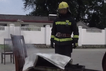 圖片中可以看到,可樂的效果竟然和水一樣,突然間的爆燃讓人始料不及。鐵鍋內的熱浪沖到了消防員的身上,如果不穿防護裝備的話,肯定會被燒傷。