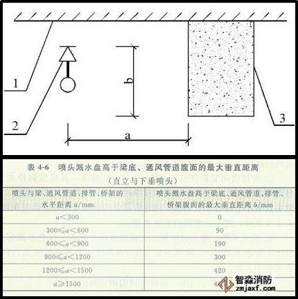 · 當噴頭濺水盤高于附近梁底或寬度小于1.2m的風管、排管、橋架腹面時,噴頭濺水盤高于梁底、風管、排管、橋架腹面的最大垂直距離應符合下表的規定: