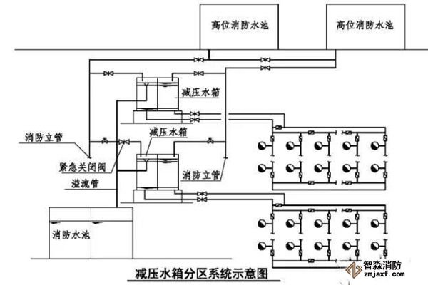 分區供水形式應根據系統壓力、建筑特征,經技術經濟和安全可靠性等綜合因素確定,可采用消防水泵并行或串聯、減壓水箱和減壓閥減壓的形式,但當系統的工作壓力大于2.40MPa時,應采用消防水泵串聯或減壓水箱分區供水形式。