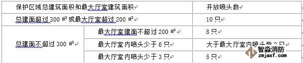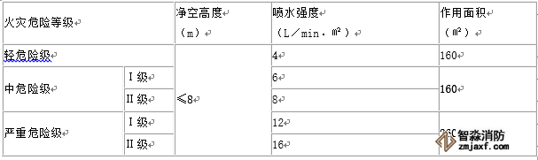 應符合下表的要求。僅在走道設置單排閉式噴頭的閉式系統,其作用面積應按最大疏散距離所對應的走道面積確定;裝有網格、柵板類通透性吊頂噴水強度應按規定值的1.3倍確定;干式系統的作用面積按規定值的1.3倍確定。系統最不利點處噴頭的工作壓力不應低于0.05Mpa,靜壓不應小于0.10MPa。