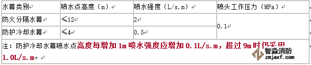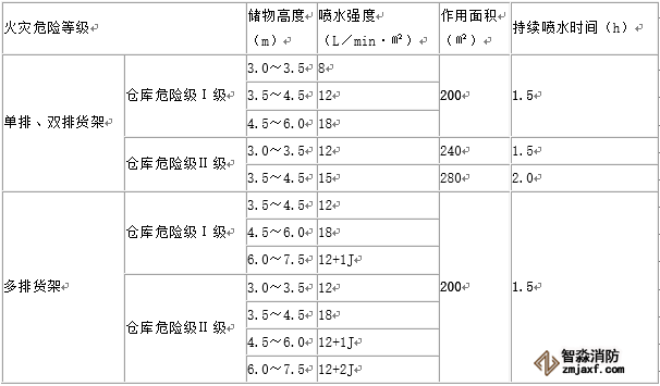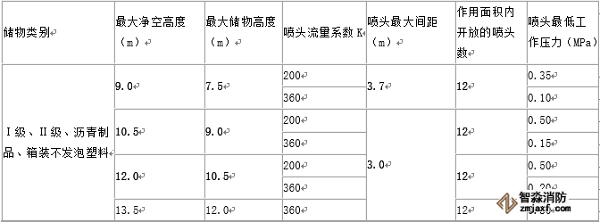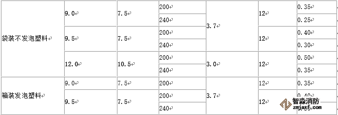 注:1.無包裝的塑料橡膠視同紙袋、塑料袋包裝。 2.貨架內置噴頭應采用與頂板下噴頭相同的噴水強度,用水量應按開放6只噴頭確定。 |